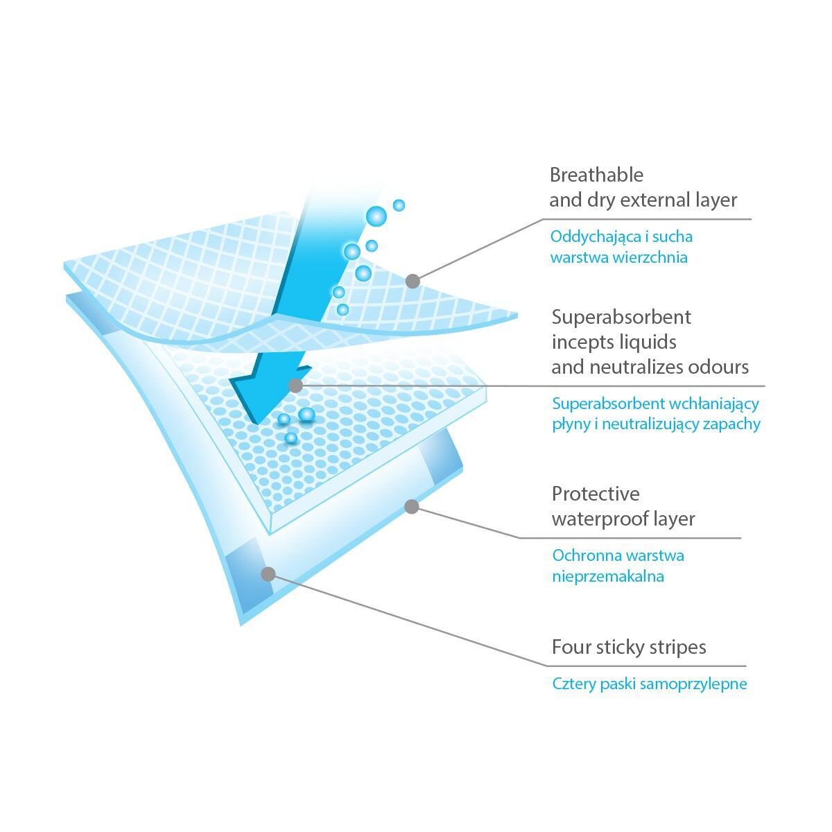 Material superabsorbent, neutralizon aromat, shtresë mbrojtëse e ajrosur, rripa vetë-ngjitës |