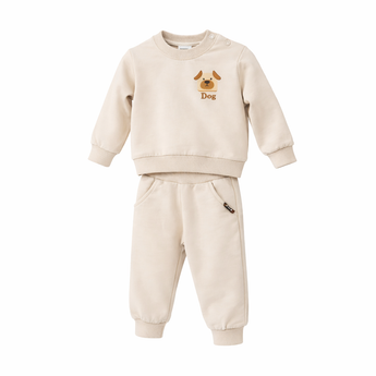 Bluza ka kopsa praktike në shpatull për veshje të lehtë, ndërsa pantallonat me bel elastik ofrojnë komoditet dhe liri lëvizjeje gjatë gjithë ditës. Dizajni minimalist dhe ngjyra neutrale e bëjnë kompletin të përshtatshëm për çdo rast dhe shumë të lehtë për kombinim.