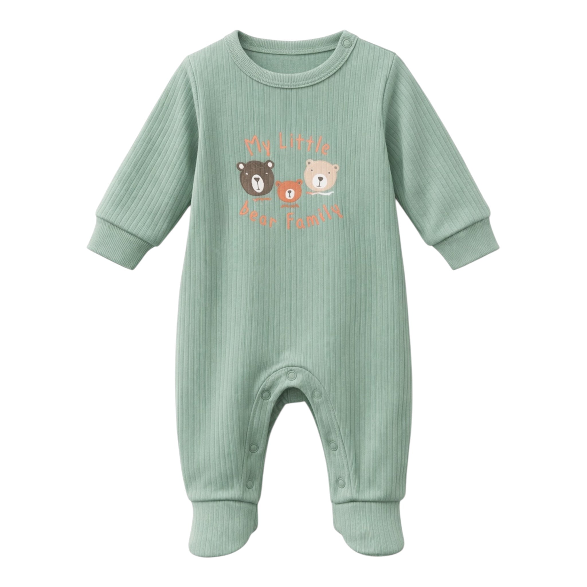 Dizajni praktik me kopsa në pjesën e poshtme e bën ndërrimin e pelenës të shpejtë dhe të lehtë, ndërsa mëngët e gjata dhe këmbëzat e mbyllura ndihmojnë në ruajtjen e ngrohtësisë. Detaji dekorativ me ilustrim arushash dhe mbishkrimin “My Little Bear Family” i jep shpihozës një pamje të ëmbël dhe lozonjare.