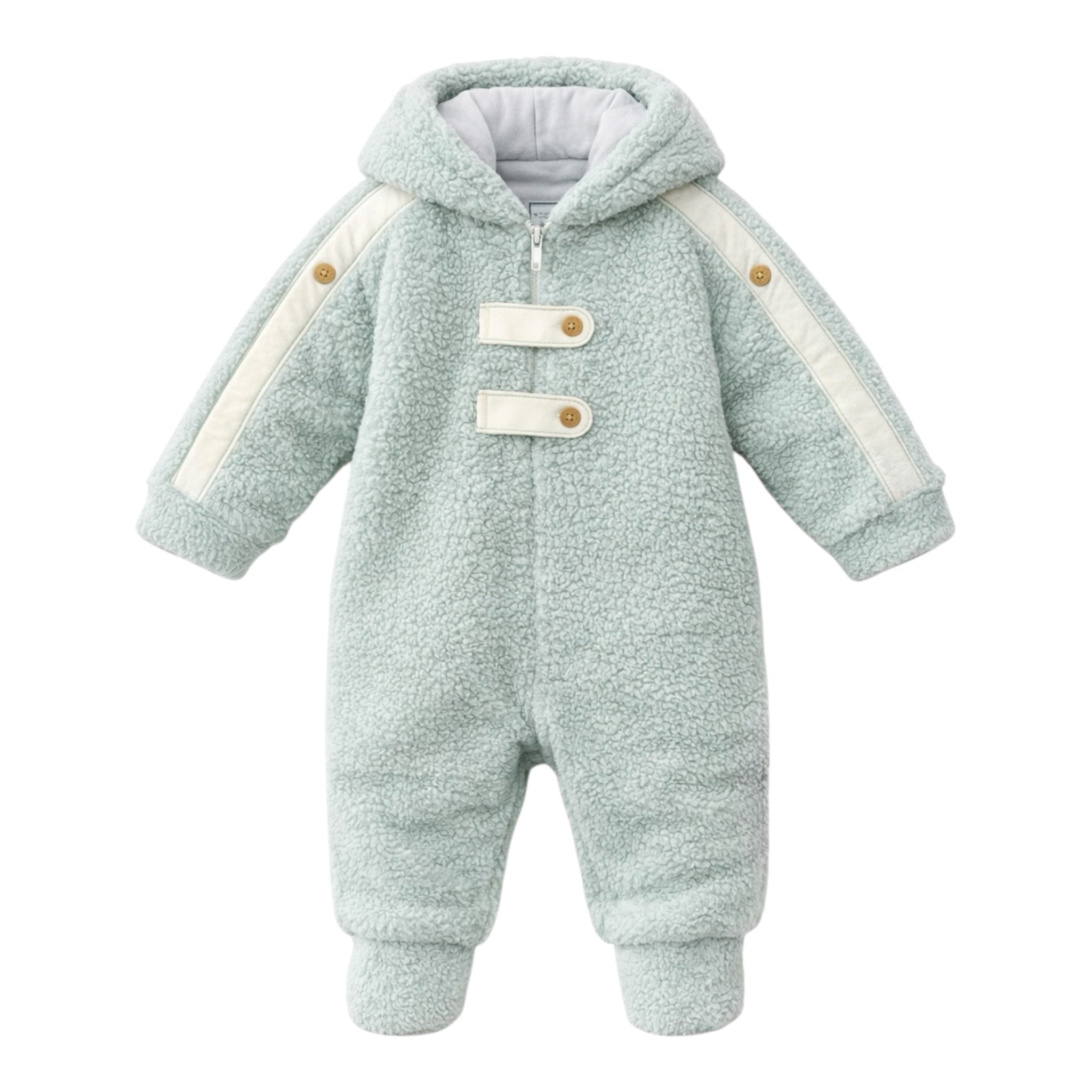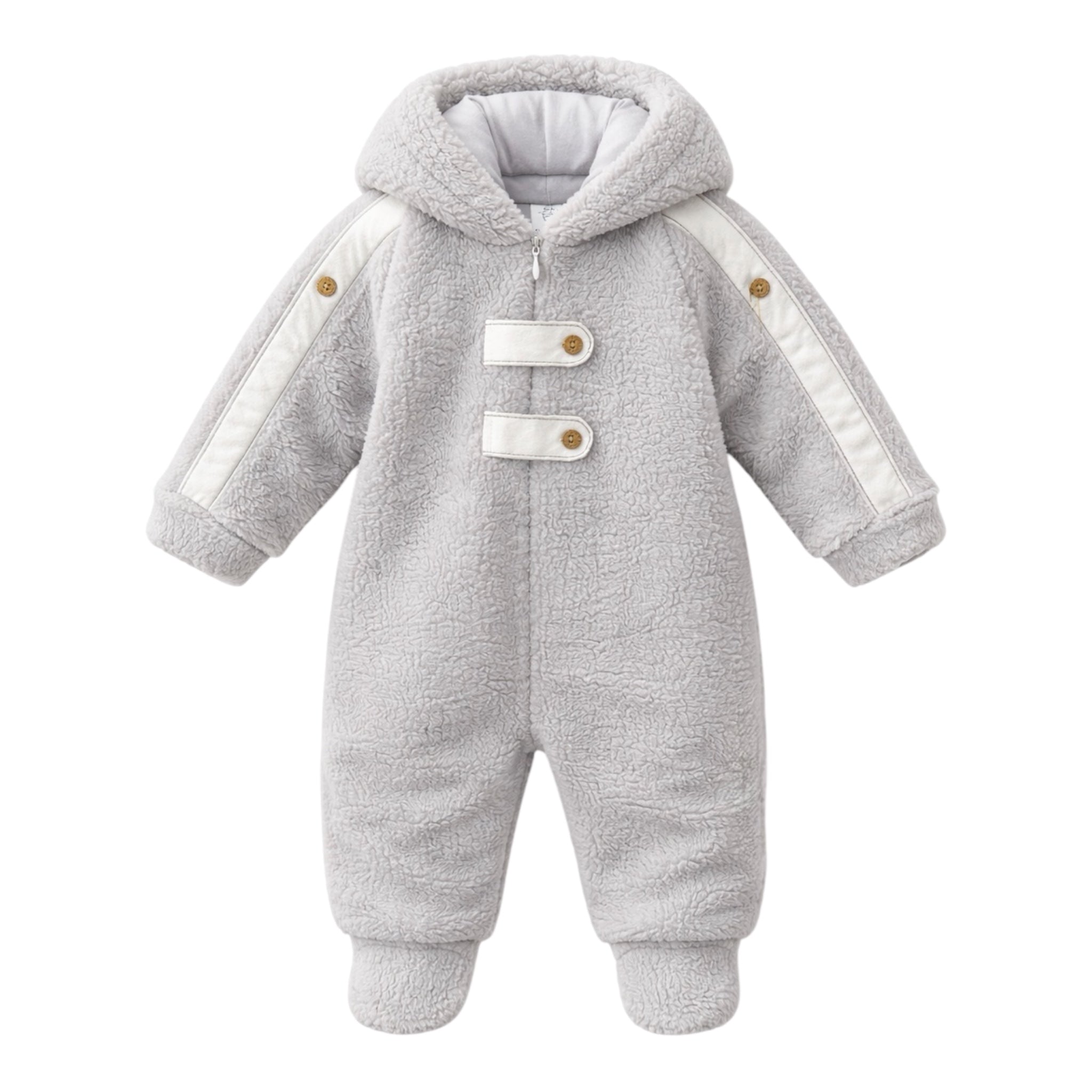 Dizajni me kapuç, zinxhir përpara dhe mbyllje shtesë dekorative e bën veshjen të lehtë dhe shumë praktike. Mëngët dhe këmbëzat e mbyllura ndihmojnë në mbrojtjen nga të ftohtit, ndërsa prerja e rehatshme lejon lëvizje të lirë për beben.