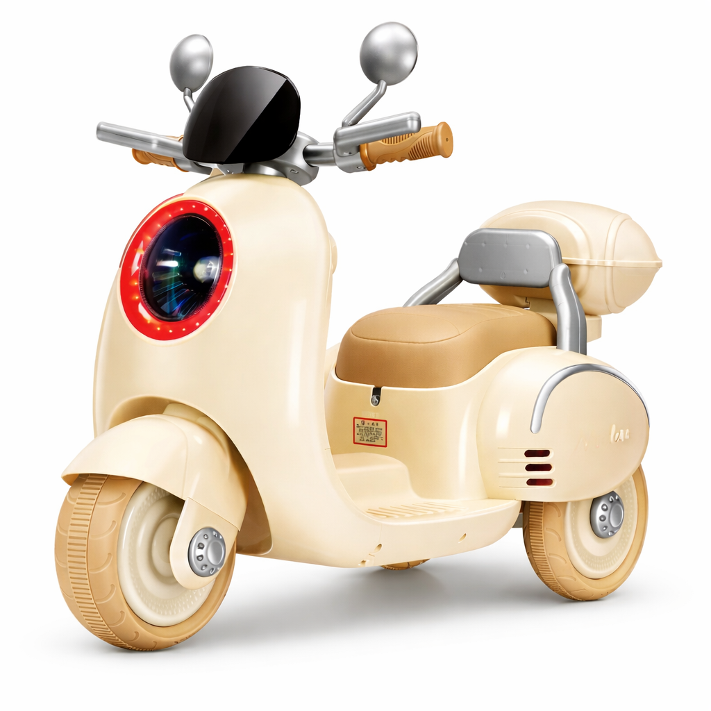 Ky motorr elektrik për fëmijë me dizajn retro modern është krijuar për të ofruar eksperiencë reale vozitjeje dhe argëtim maksimal. I pajisur me fener LED rrethor me ndriçim dekorativ, pasqyra anësore dhe panel muzikor me efekte zanore, ky model e bën çdo shëtitje më emocionuese.