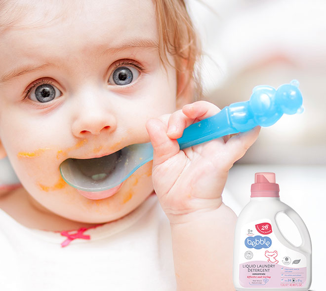 Edhe pse foshnjat janë të vogla dhe të ëmbla, rrobat e tyre mund të krijojnë një mal të madh larjeje. Bebble Liquid Laundry Detergent është formulë e butë, por njëkohësisht pastron në mënyrë të shkëlqyer, duke i lënë rrobat e foshnjës të pastër dhe të buta. Me shtimin e sapunit natyral, rrobat pastrohen edhe në 30°C, ndërsa përbërësit aktivë janë 100% të biodegradueshëm dhe shpëlahen plotësisht, pa lënë mbetje kimike.