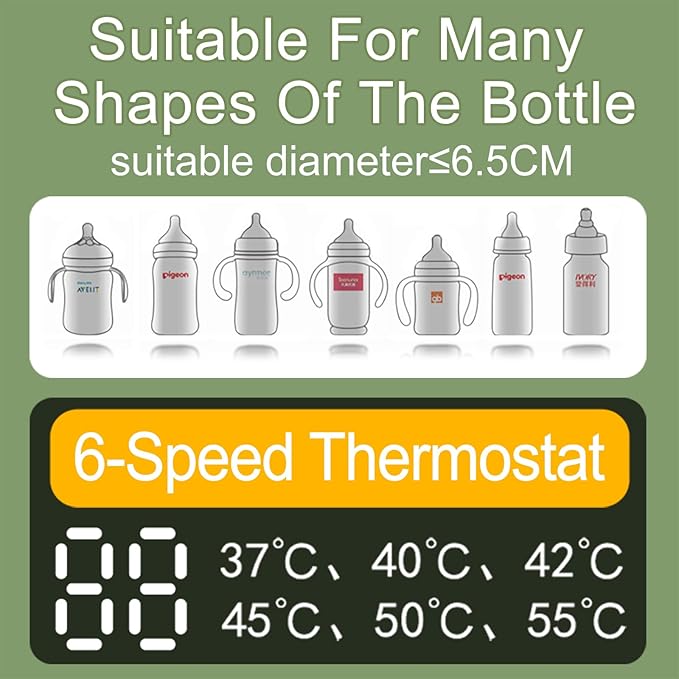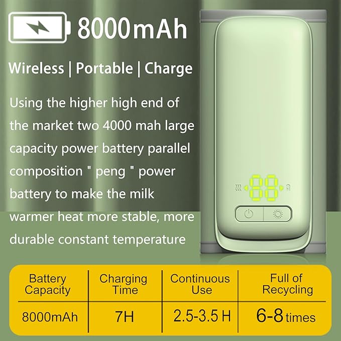 Ngrohësi ofron ngrohje të shpejtë, duke ngrohur biberonin në vetëm 20 minuta dhe duke ruajtur ngrohtësinë deri në 4-8 orë në një karikim të plotë. Me 6 nivele të temperaturës (37°C, 40°C, 42°C, 45°C, 50°C dhe 55°C), mund të zgjidhni temperaturën ideale sipas nevojave të fëmijës. Materiali i brendshëm reflektues siguron ngrohje më të shpejtë dhe ruajtje të gjatë të ngrohtësisë, ndërsa eksterieri i faux leather e bën të përshtatshëm për shishe të ndryshme.