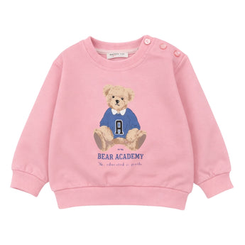 Bluzë me mëngë të gjata, e dizajnuar për komoditet dhe stil të përditshëm. Ka print të ëmbël arushi “Bear Academy” në pjesën e përparme, që i jep pamje të butë dhe moderne. E pajisur me kopsa në shpatull, të cilat lehtësojnë veshjen dhe zhveshjen, veçanërisht për bebet më të vogla.