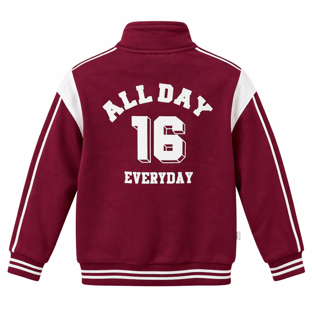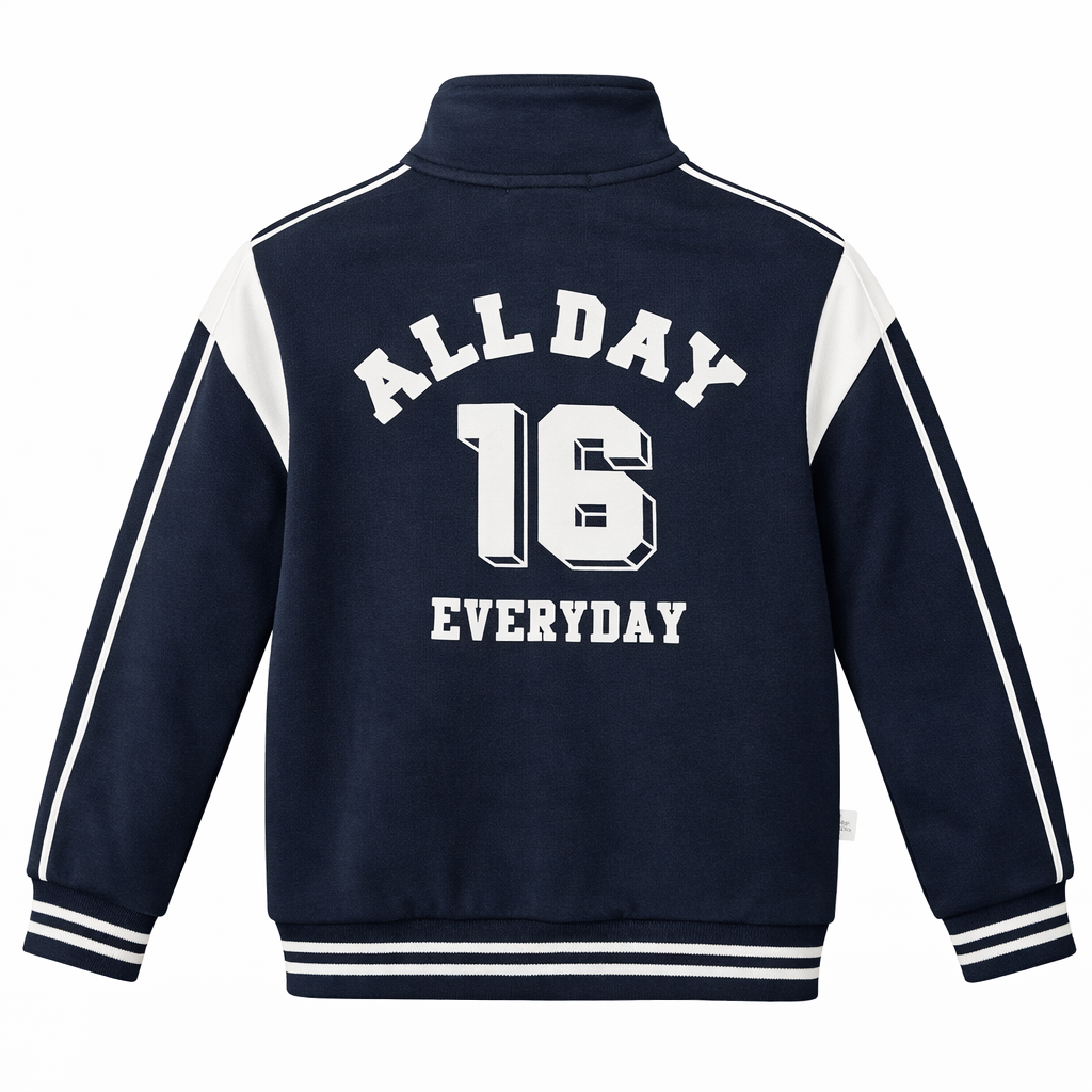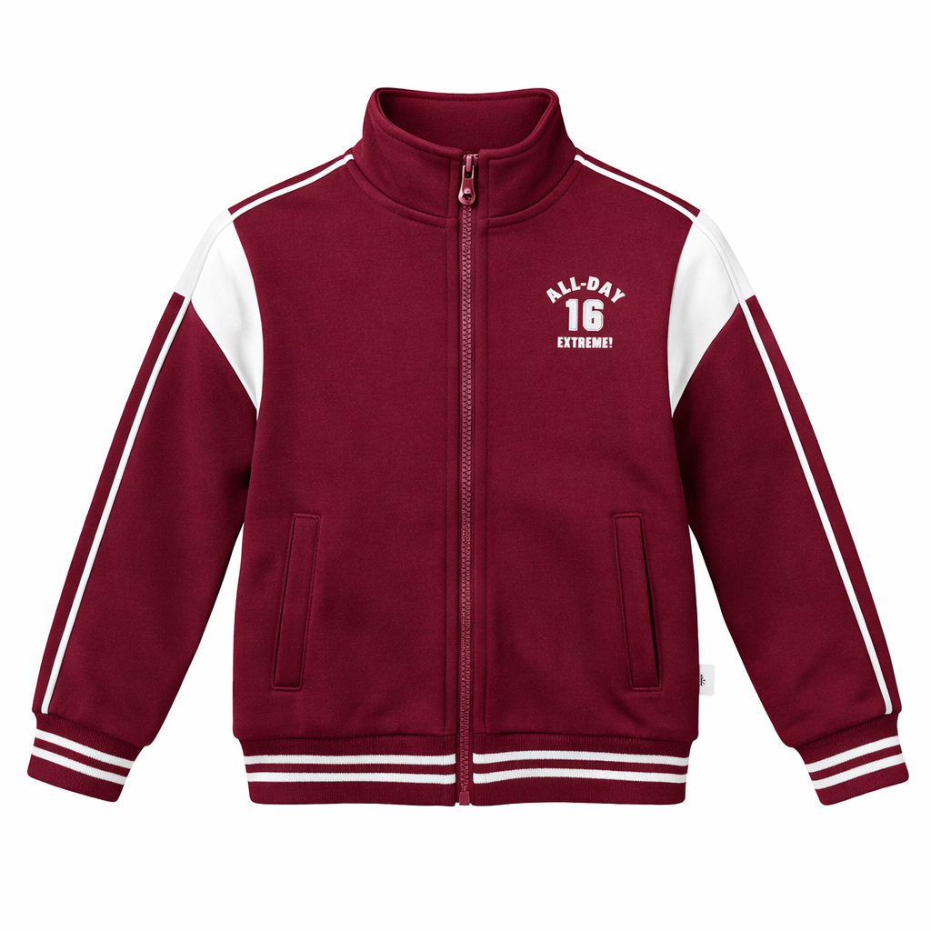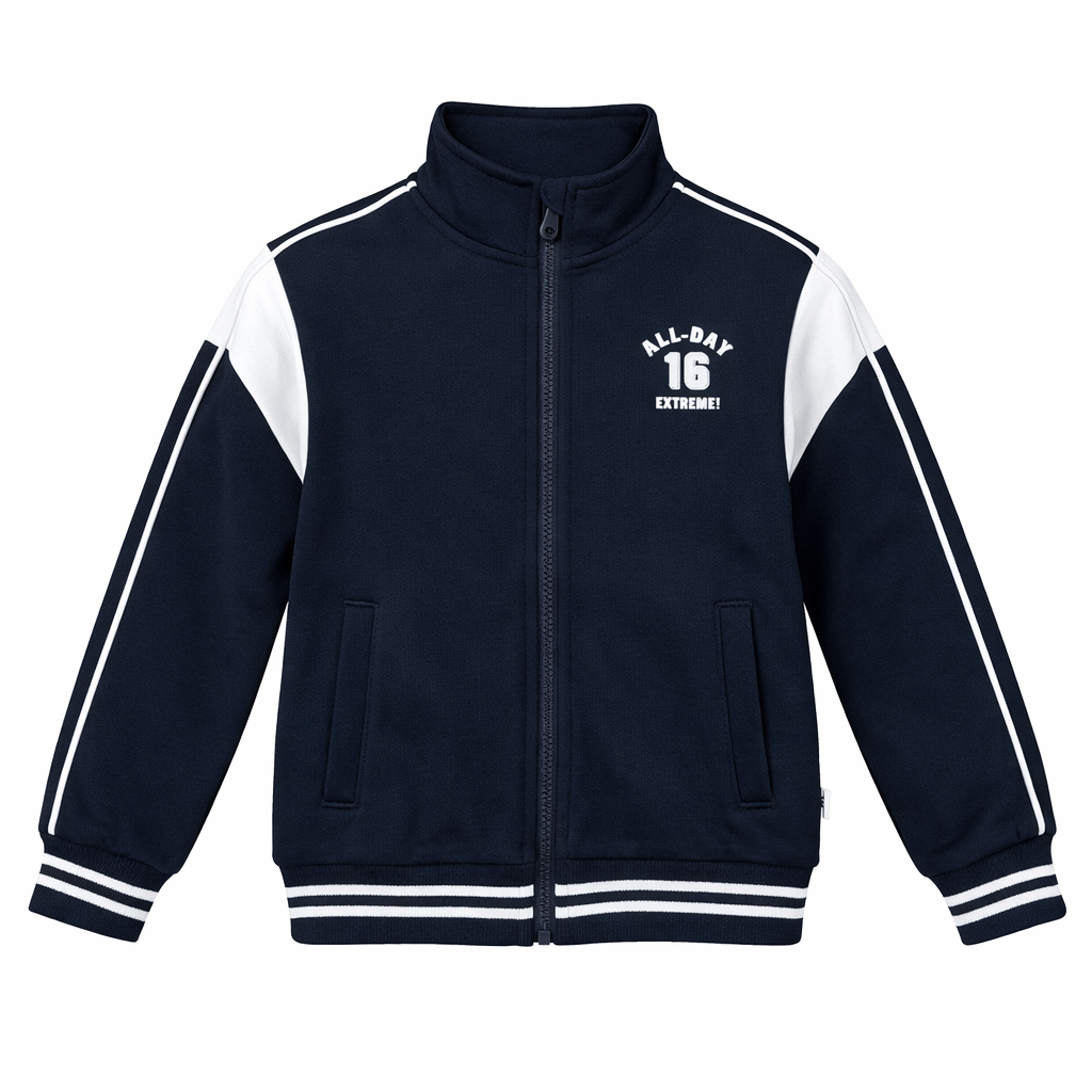 Dizajni me zinxhir të plotë dhe jakë të ngritur ndihmon në mbajtjen e ngrohtësisë, ndërsa detajet sportive me vija kontrastuese në mëngë i japin një pamje moderne dhe dinamike. Xhepat anësorë ofrojnë praktikitet, ndërsa mbishkrimi “ALL-DAY 16 EXTREME!” shton një stil urban dhe sportiv.