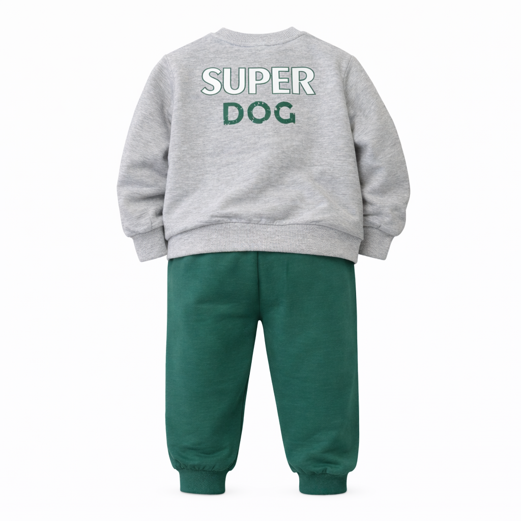 Duksi me jakë të rrumbullakët ka dizajn të thjeshtë dhe modern, me detaj grafik lozonjar që i jep pamje të veçantë. Pantallonat sportive me bel elastik dhe mansheta në fund sigurojnë përshtatje të rehatshme dhe praktike, ideale për lojë, shkollë apo shëtitje.