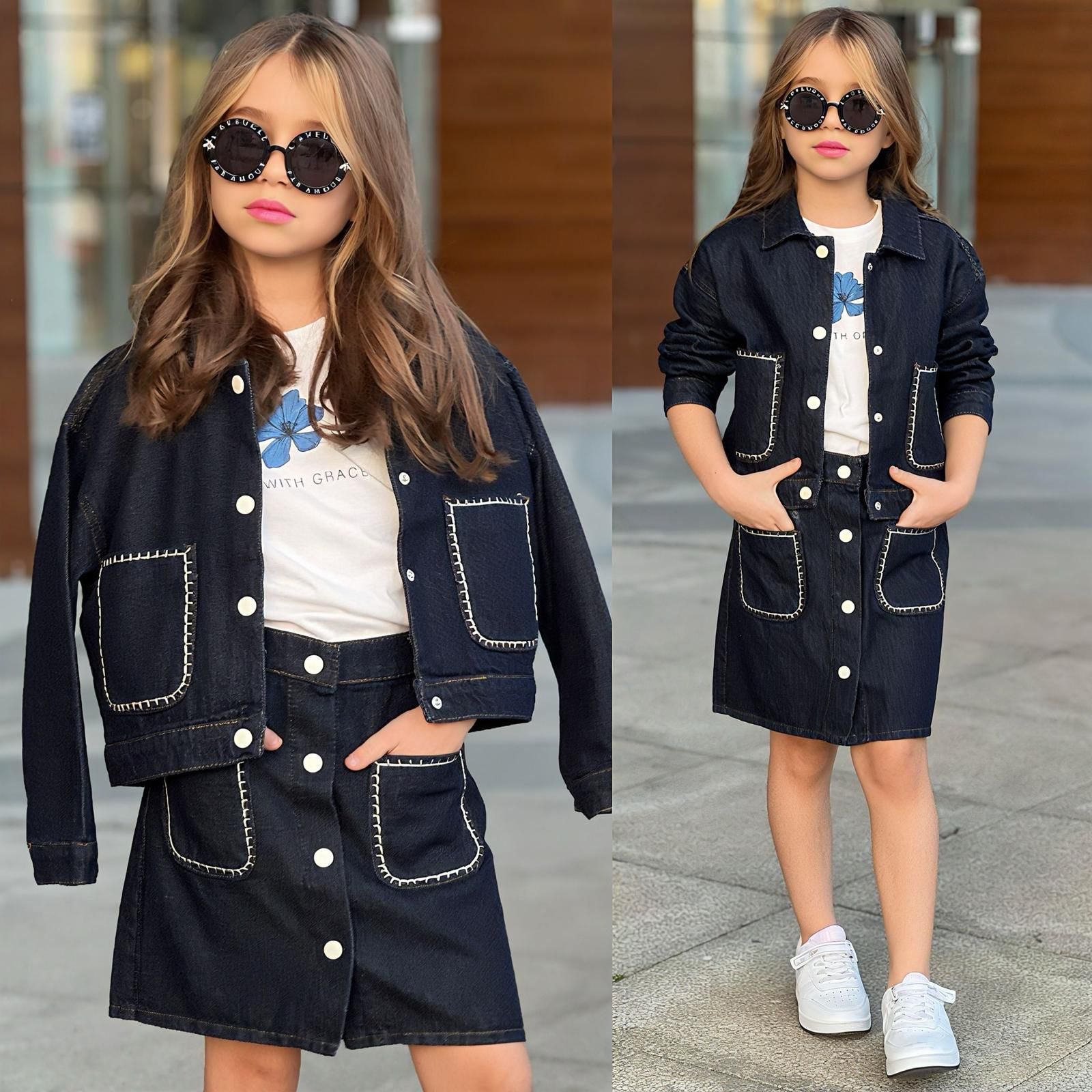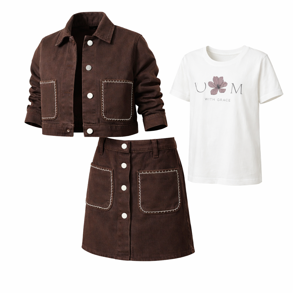 Set 3-pjesësh për vajza i dizajnuar për stil modern dhe rehati të përditshme. Ky komplet përfshin xhaketë, maicë dhe fund, të kombinuara në mënyrë perfekte për një pamje të kuruar dhe praktike.