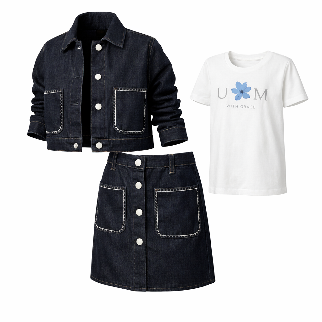 Xhaketa dhe fundi janë të punuara nga material farmerk, i qëndrueshëm dhe rezistent, ideal për përdorim të përditshëm, ndërsa maica prej pambuku ofron butësi dhe rehati maksimale për lëkurën e fëmijës.