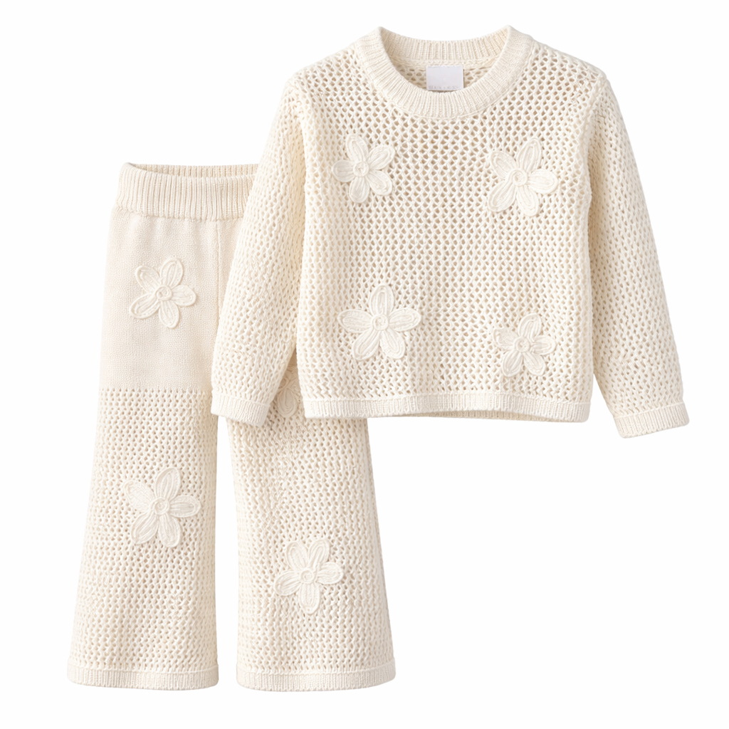 Ky komplet për vajza përbëhet nga një triko e thurur me mëngë të gjata, e dekoruar me detaje lulesh të punuara, e kombinuar me pantallona të gjata me prerje të rehatshme. Dizajni i ajrosur i thurjes i jep setit një pamje të lehtë dhe elegante, duke e bërë të përshtatshëm për përdorim të përditshëm apo dalje të veçanta.