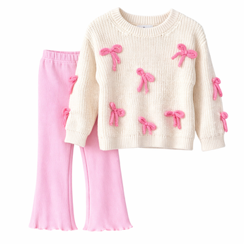 Ky set i bukur për vajza kombinon rehati maksimale me një dizajn të ëmbël dhe elegant. I përbërë nga një triko e butë ngjyrë krem me detaje fjongo pink dhe pantallona të rehatshme ngjyrë rozë, ky komplet është ideal për veshje të përditshme apo dalje speciale.