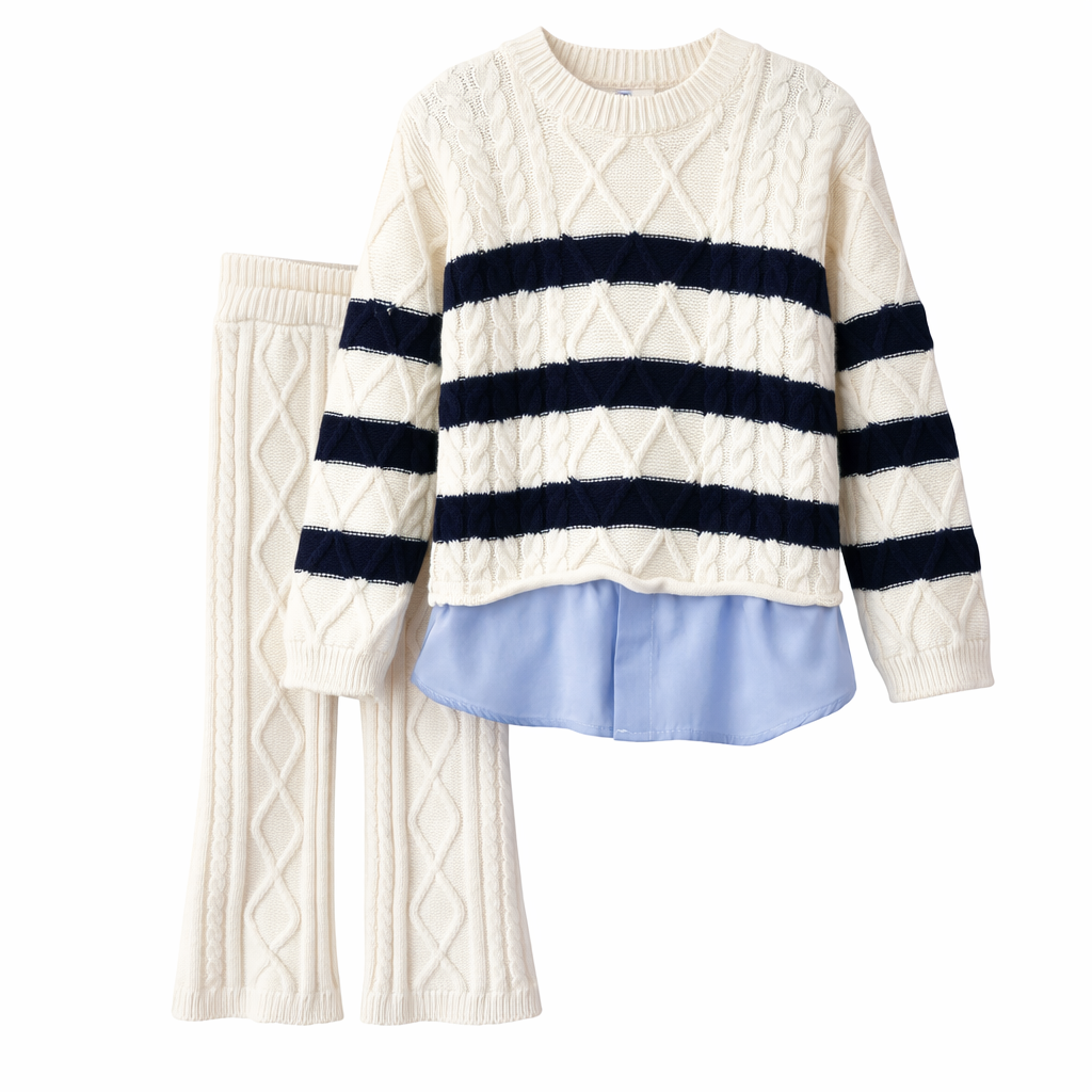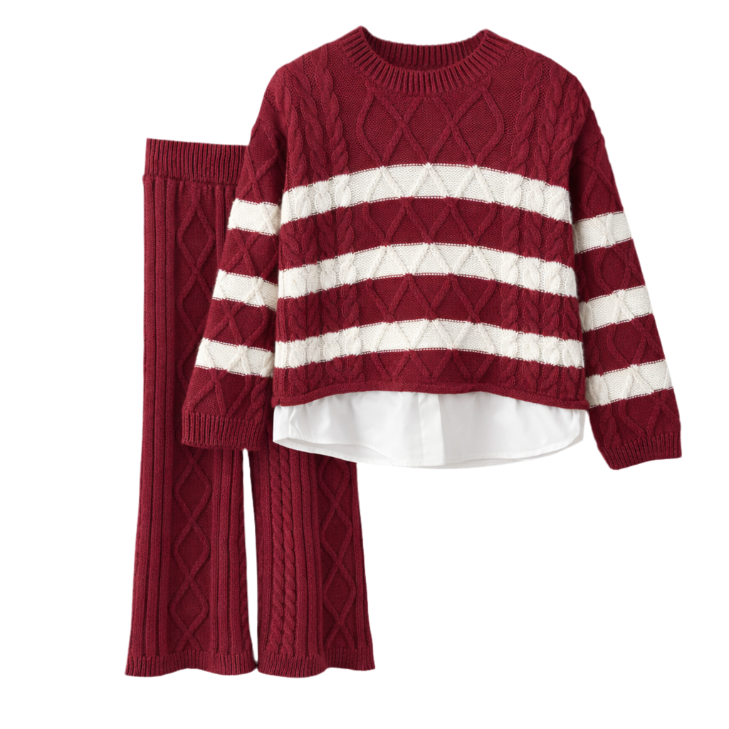 Ky set elegant dhe i rehatshëm për fëmijë përbëhet nga një bluzë triko me dizajn modern dhe pantallona të përputhshme, ideal për ditët e freskëta. Bluza ka motive të punuara bukur në thurje dhe kombinim ngjyrash bordo me vija të bardha, duke i dhënë një pamje të ngrohtë dhe stil të veçantë. Shtresa e bardhë poshtë bluzës krijon efektin e këmishës, duke e bërë setin të duket më i kuruar dhe elegant.