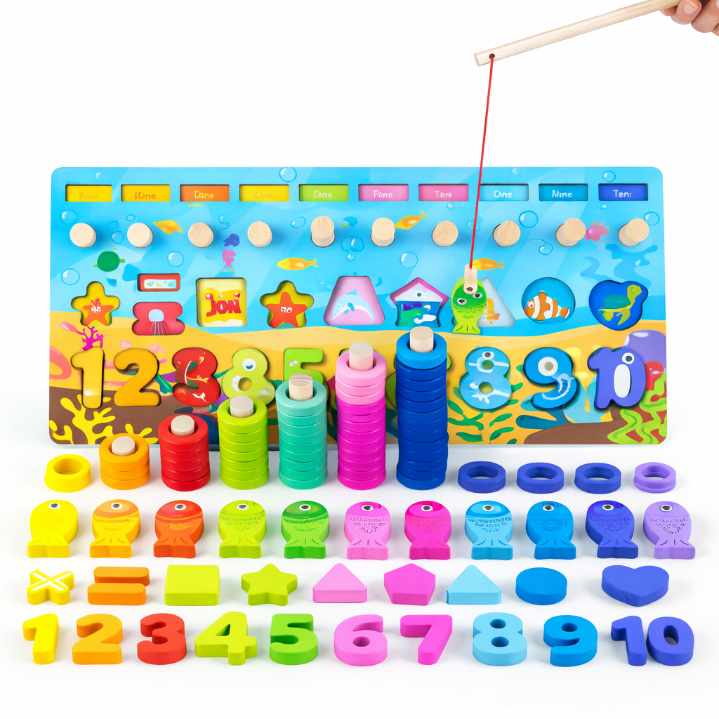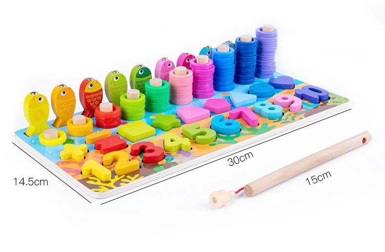 Kjo lodër edukative Montessori prej druri është krijuar për të ndihmuar fëmijët të mësojnë përmes lojës aktive dhe argëtuese. Tabela përfshin numra, forma gjeometrike, unaza për renditje, peshq për lojë peshkimi magnetik dhe aktivitete për përputhje ngjyrash, duke ofruar një përvojë të plotë mësimore në një lodër të vetme.