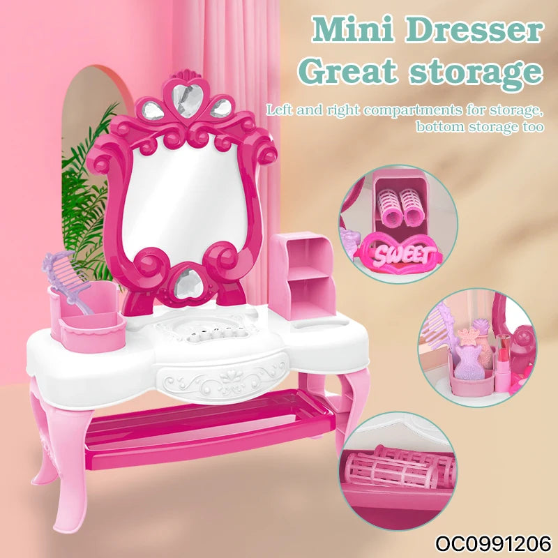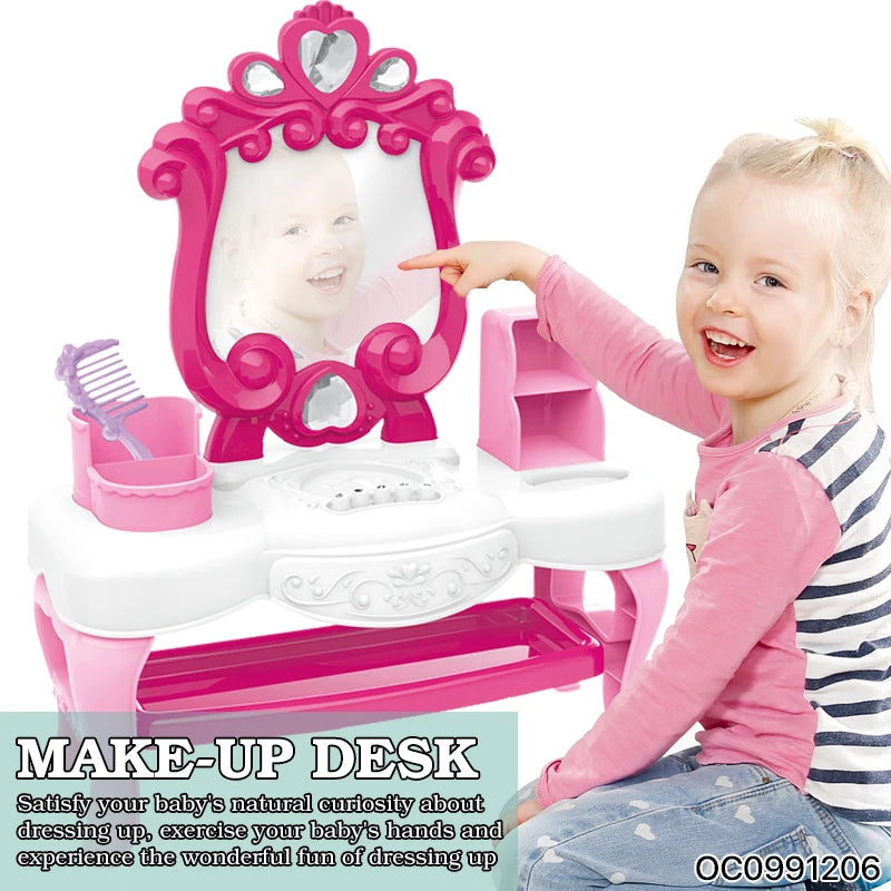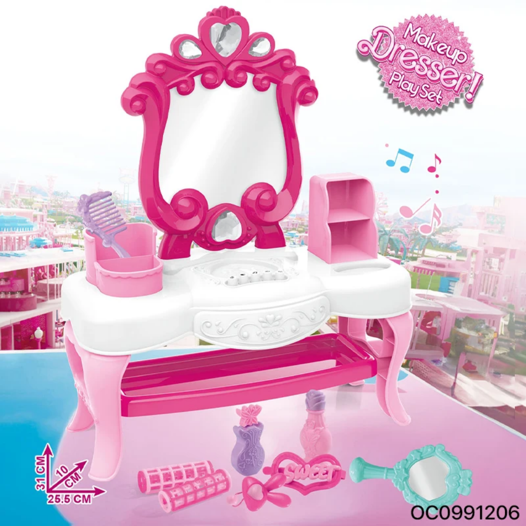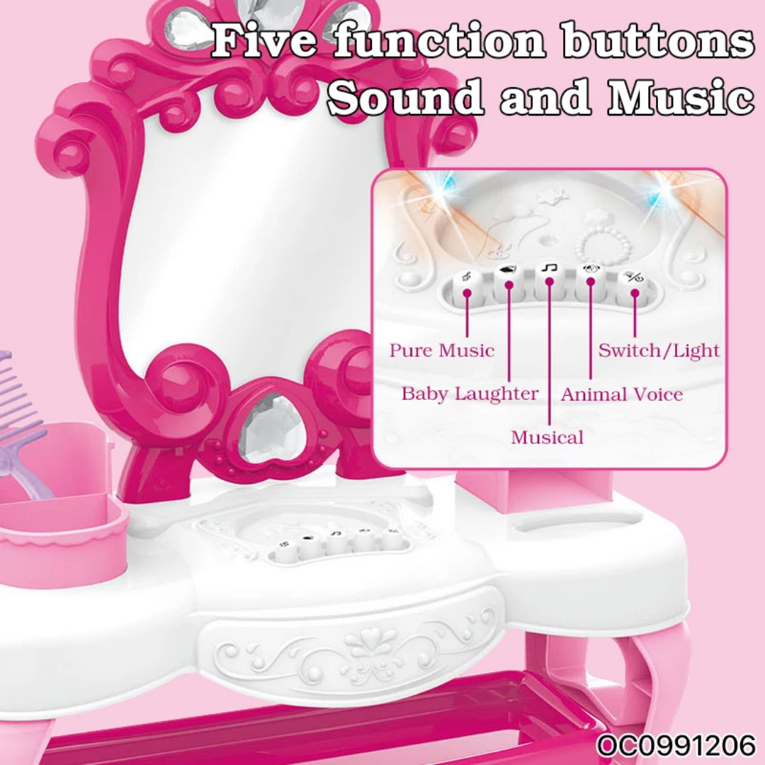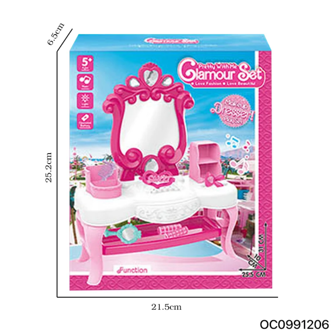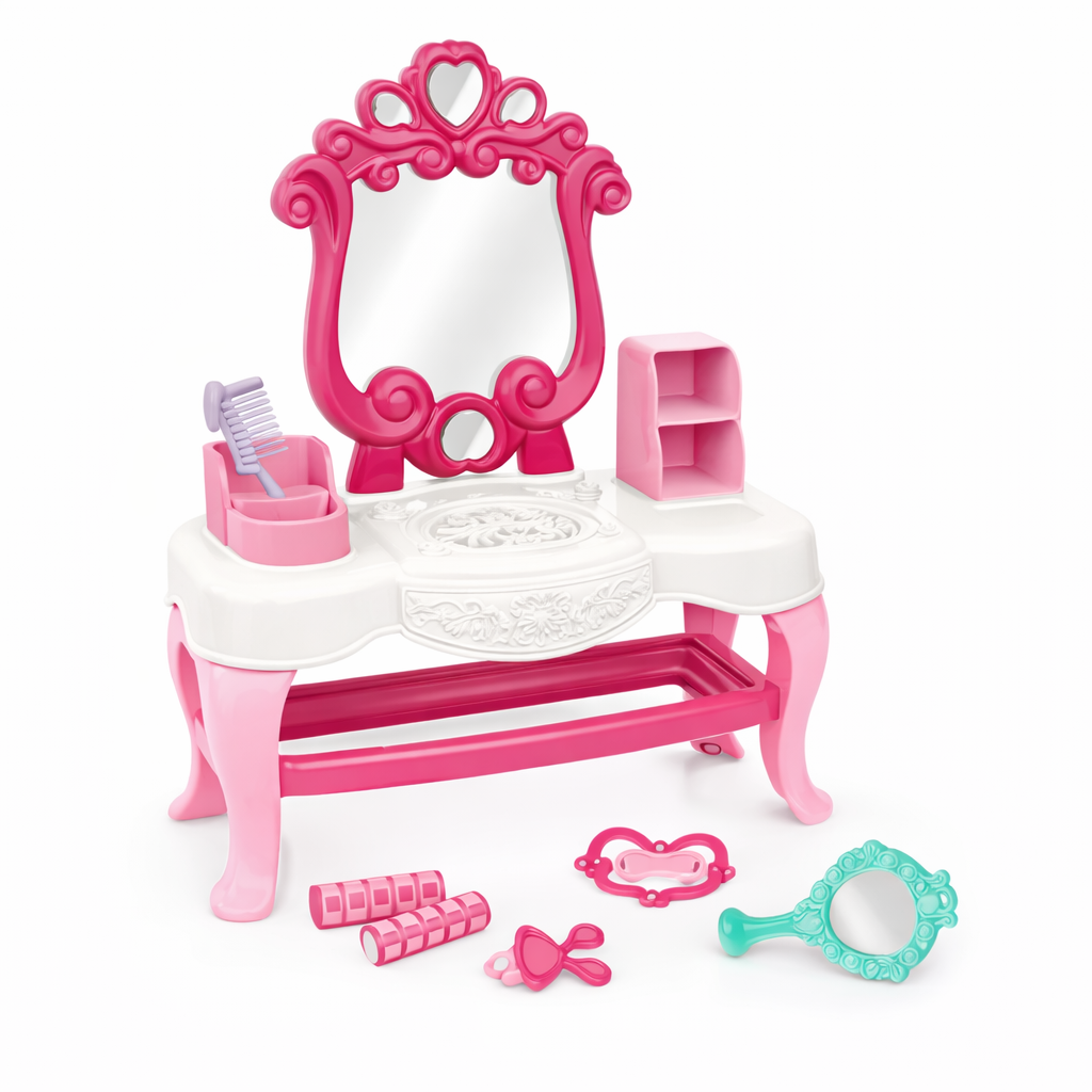 Seti përfshin pasqyrë lodër, si dhe aksesorë bukurie si furçë flokësh, shishe parfumi lodër, buzëkuq lodër, kapëse flokësh dhe aksesorë të tjerë, që i lejojnë fëmijët të luajnë role dhe të krijojnë skenarë të ndryshëm loje. Tavolina është e projektuar me sipërfaqe të lëmuara dhe të sigurta për fëmijë, pa skaje të mprehta.