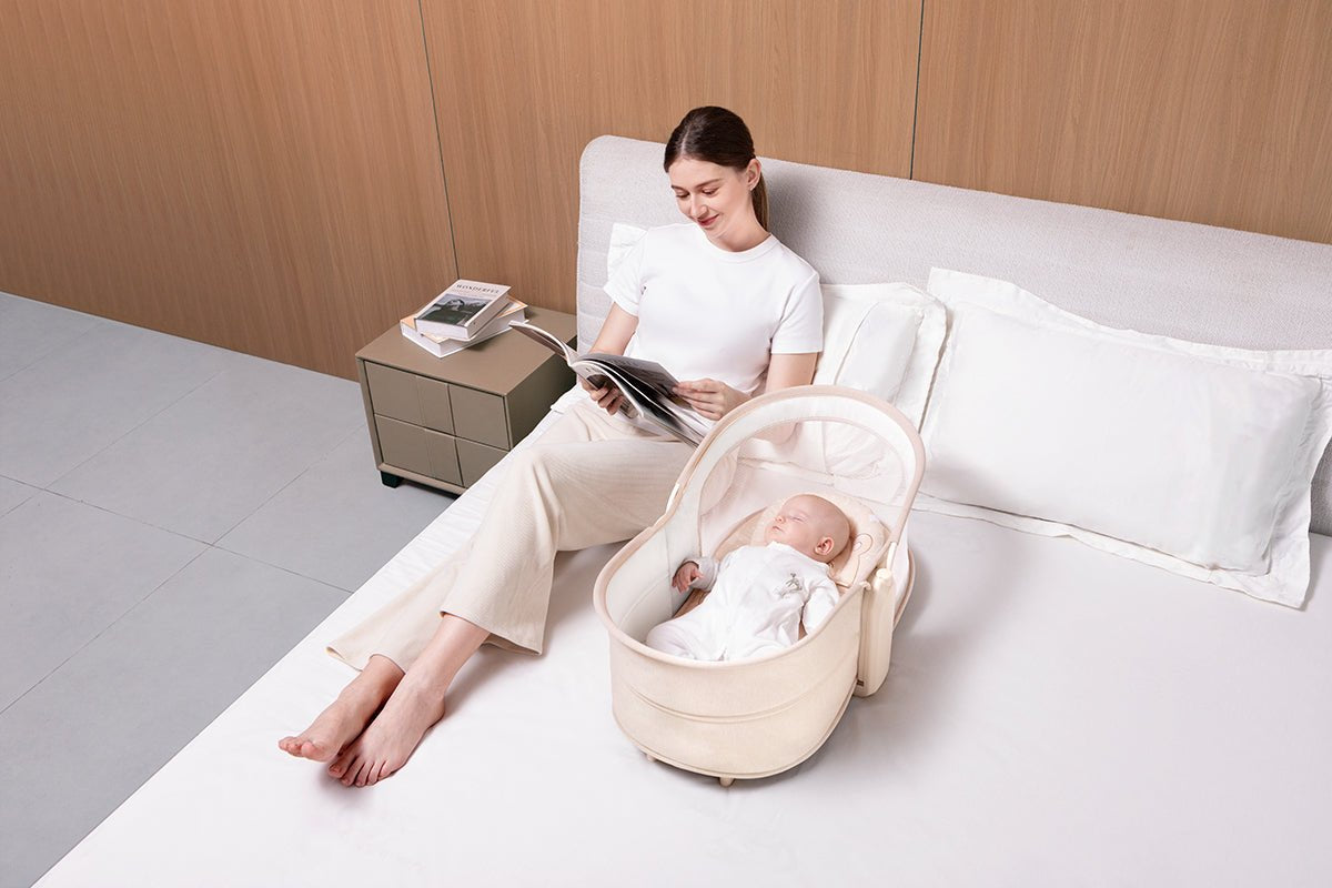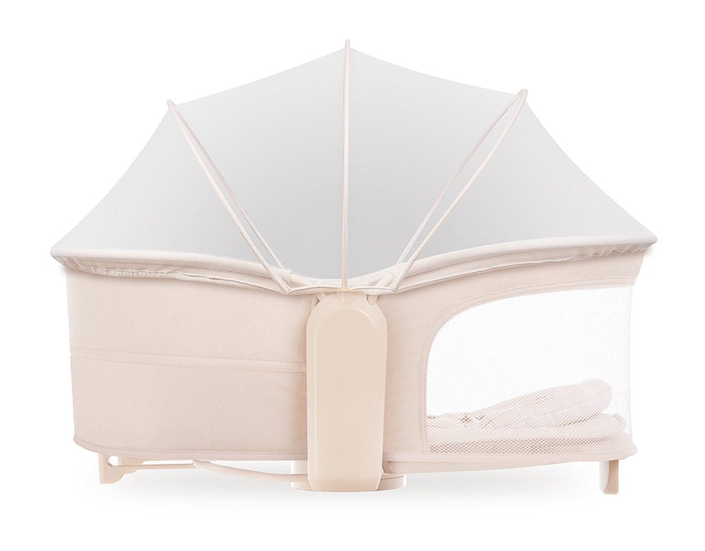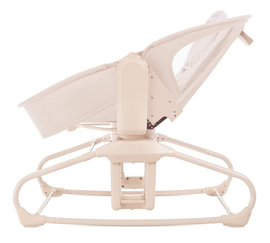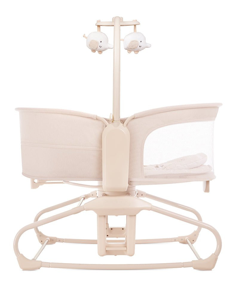 Falë sistemit rrotullues 360°, mund të zgjidhni lëvizjen anësore ose para-mbrapa, sipas preferencës së bebes. Djepi është i çmontueshëm dhe mund të përdoret edhe mbi shtrat, duke ju mundësuar afërsi maksimale me të voglin tuaj.