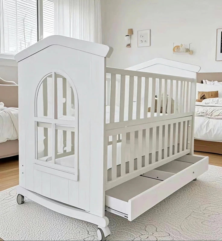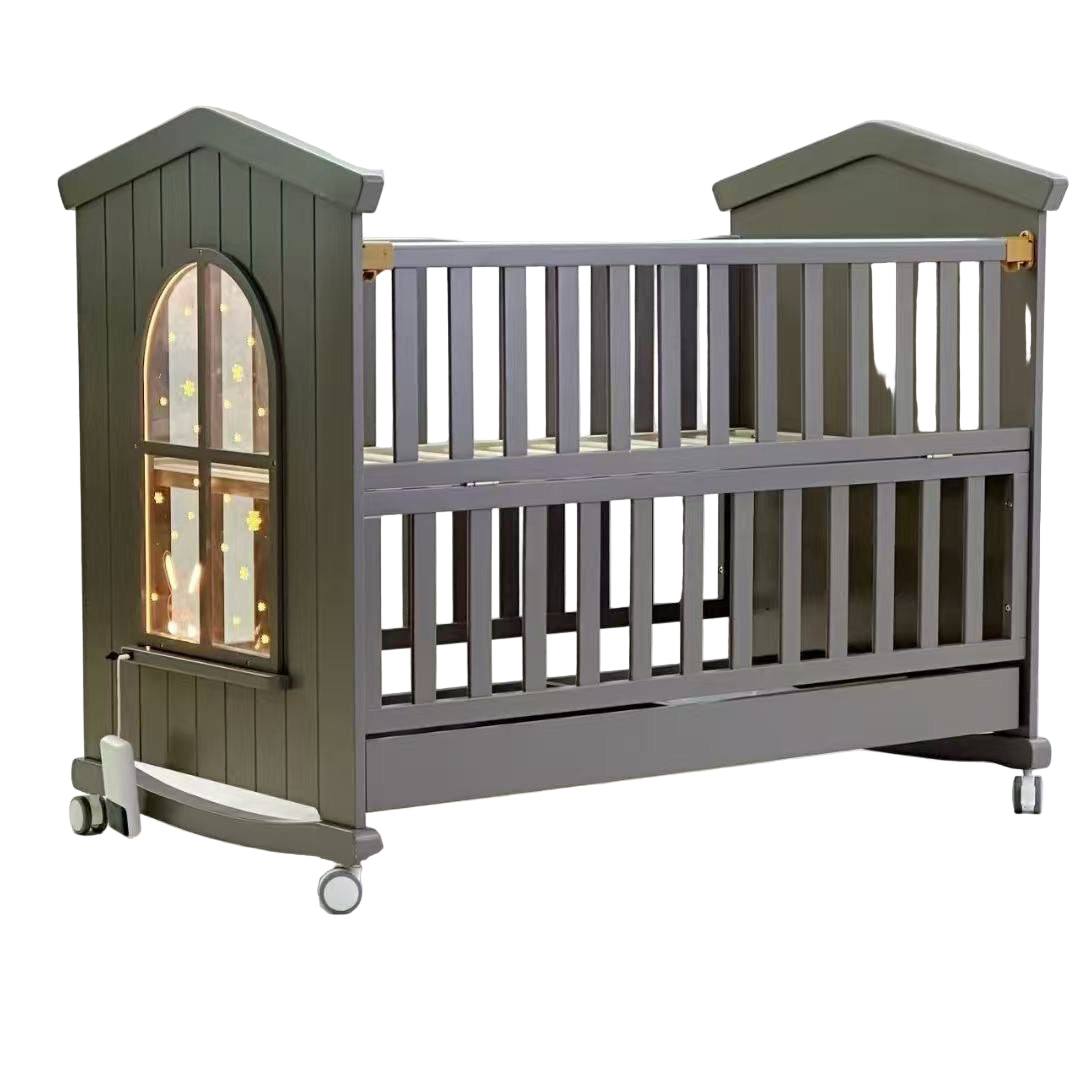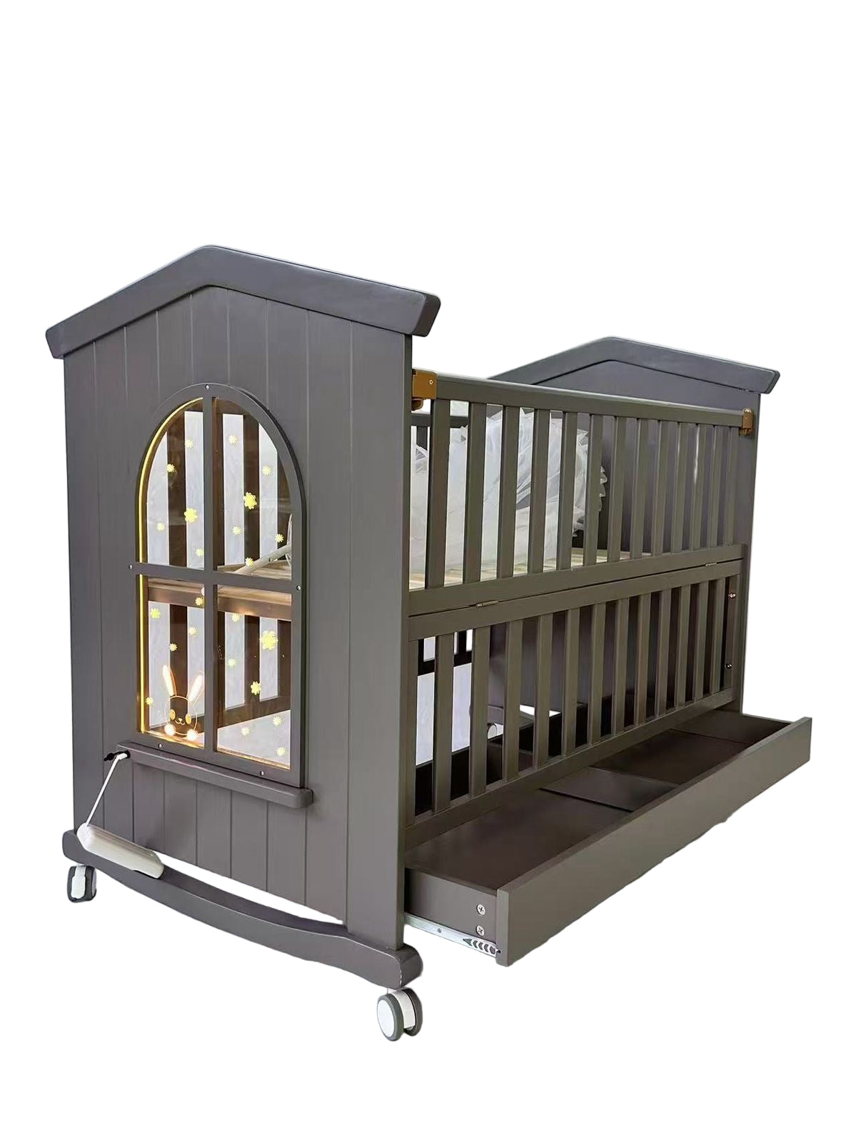 Ky shtrat premium për bebe sjell një dizajn unik me formë shtëpize dhe dritare dekorative me ndriçim LED, duke krijuar një ambient të ngrohtë dhe të qetë për gjumin e foshnjës.