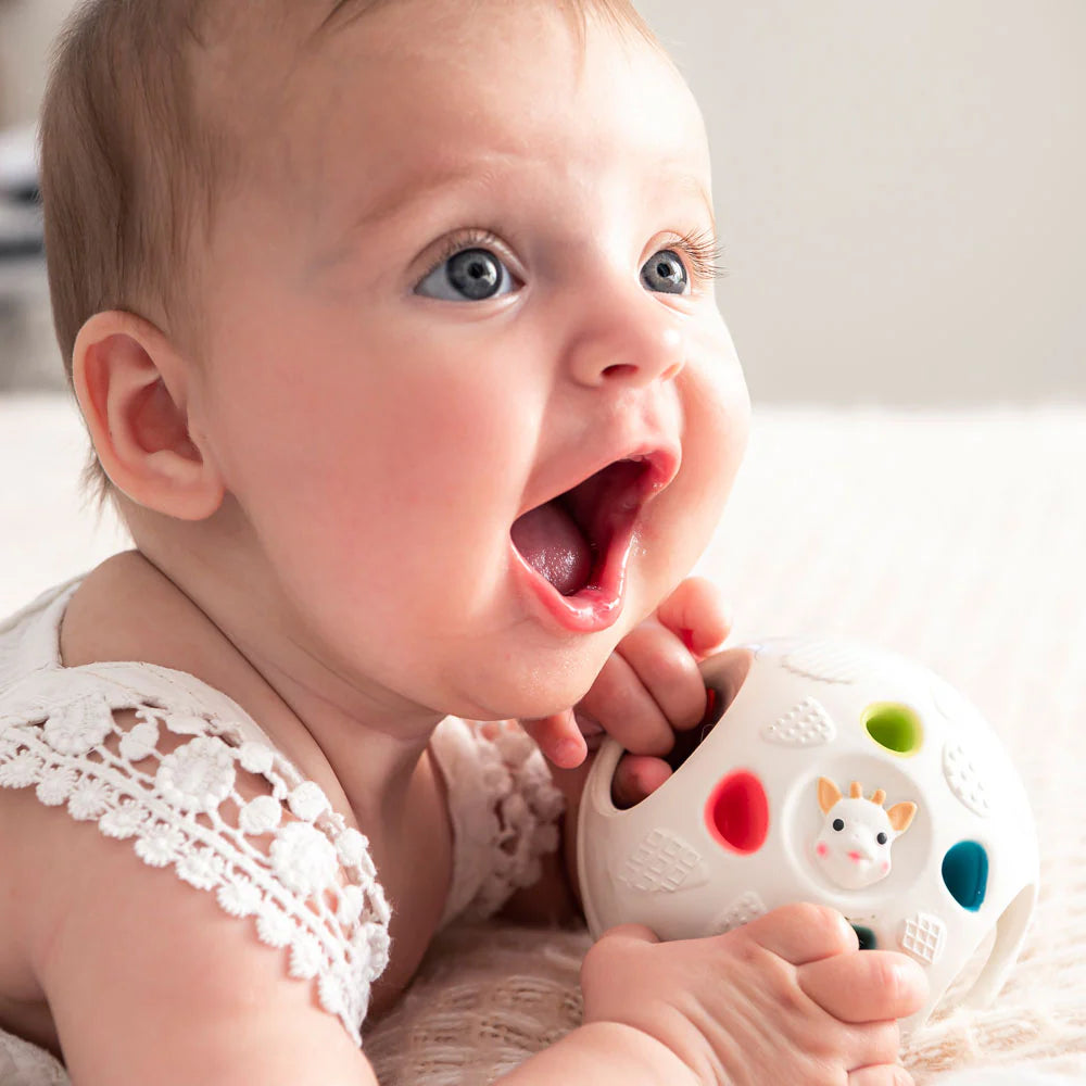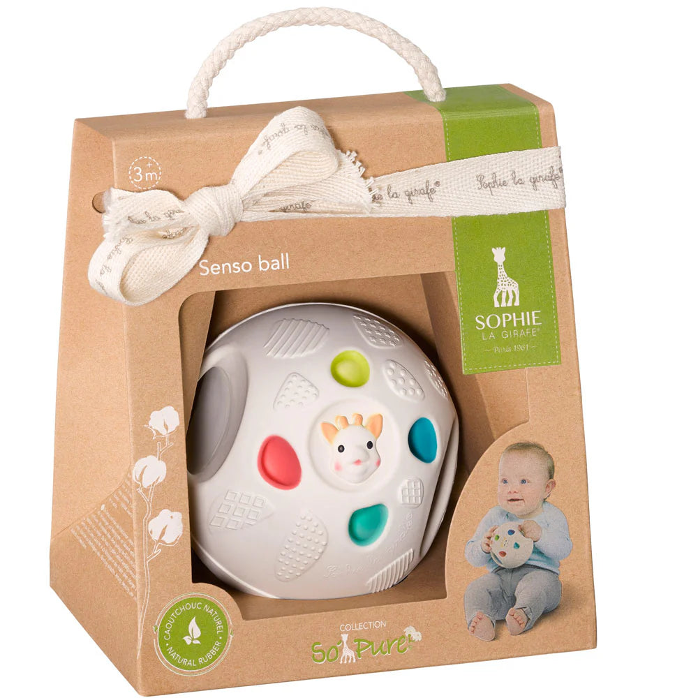 Топката So'Pure Senso од Sophie la Girafe е дизајнирана да помогне во развојот на моторните вештини на бебето. Направена од природна гума, има различни текстури за сензорна стимулација и е лесна за фаќање и гризе, смирувајќи ги непцата за време на никнувањето на забите.